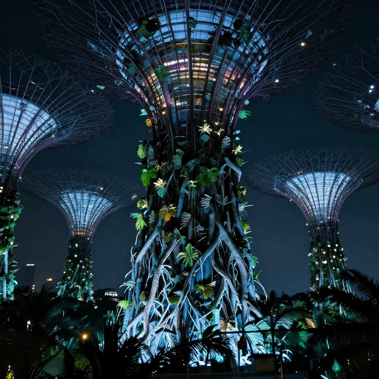 Discover towering arboreal city in this enchanting page from Pulse's A-Z adventure. A towering tree-city glows with soft blue lights, home to whispering leaves and sleepy stars. Perfect for young readers ages 3-8.
