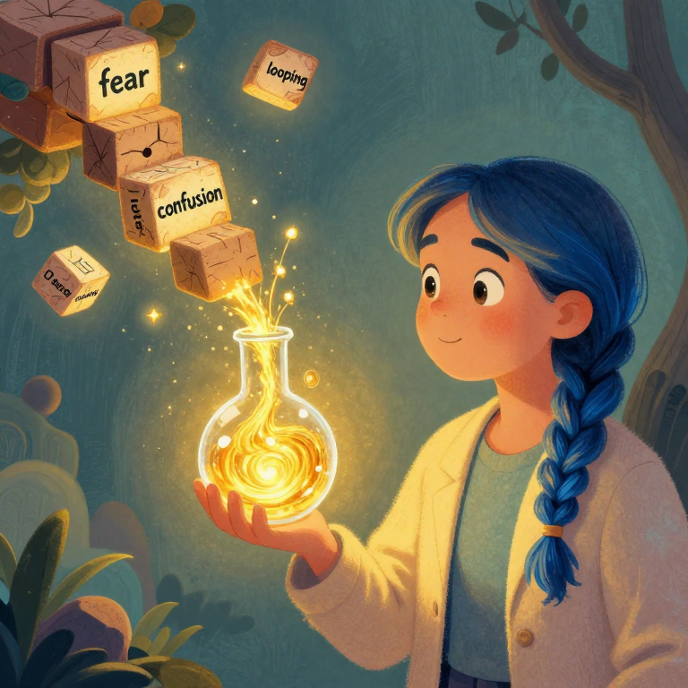 Discover Transmutation in this enchanting page from BH Alchemy A-Z Guide's A-Z adventure. In the alchemist's gaze, fear and confusion transmute into golden stepping stones of clarity. Perfect for young readers ages 3-8.