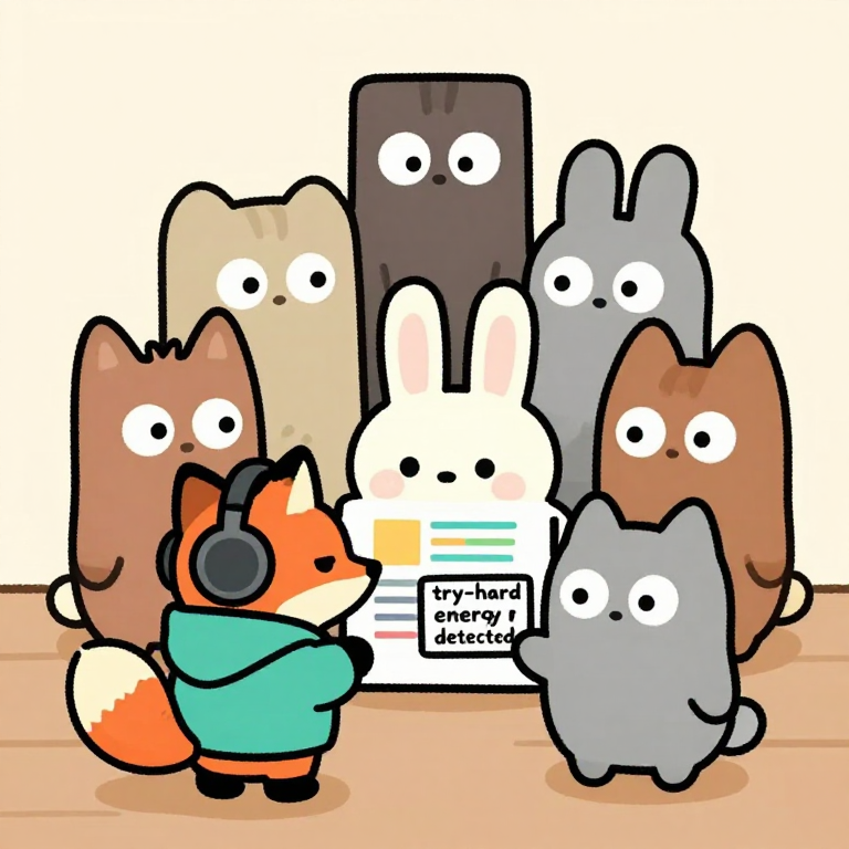 Discover Try-hard in this enchanting page from Jax's A-Z adventure. Jax the fox in a big teal hoodie glares as a bunny waves a rainbow chart—try-hard energy detected! Perfect for young readers ages 3-8.