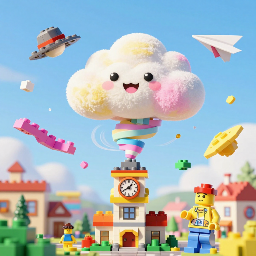 Discover Twirl in this enchanting page from Sunny's A-Z adventure. Sunny the cloud twirls in a pastel spiral, lifting hats and planes in a joyful, blocky tornado of color. Perfect for young readers ages 3-8.