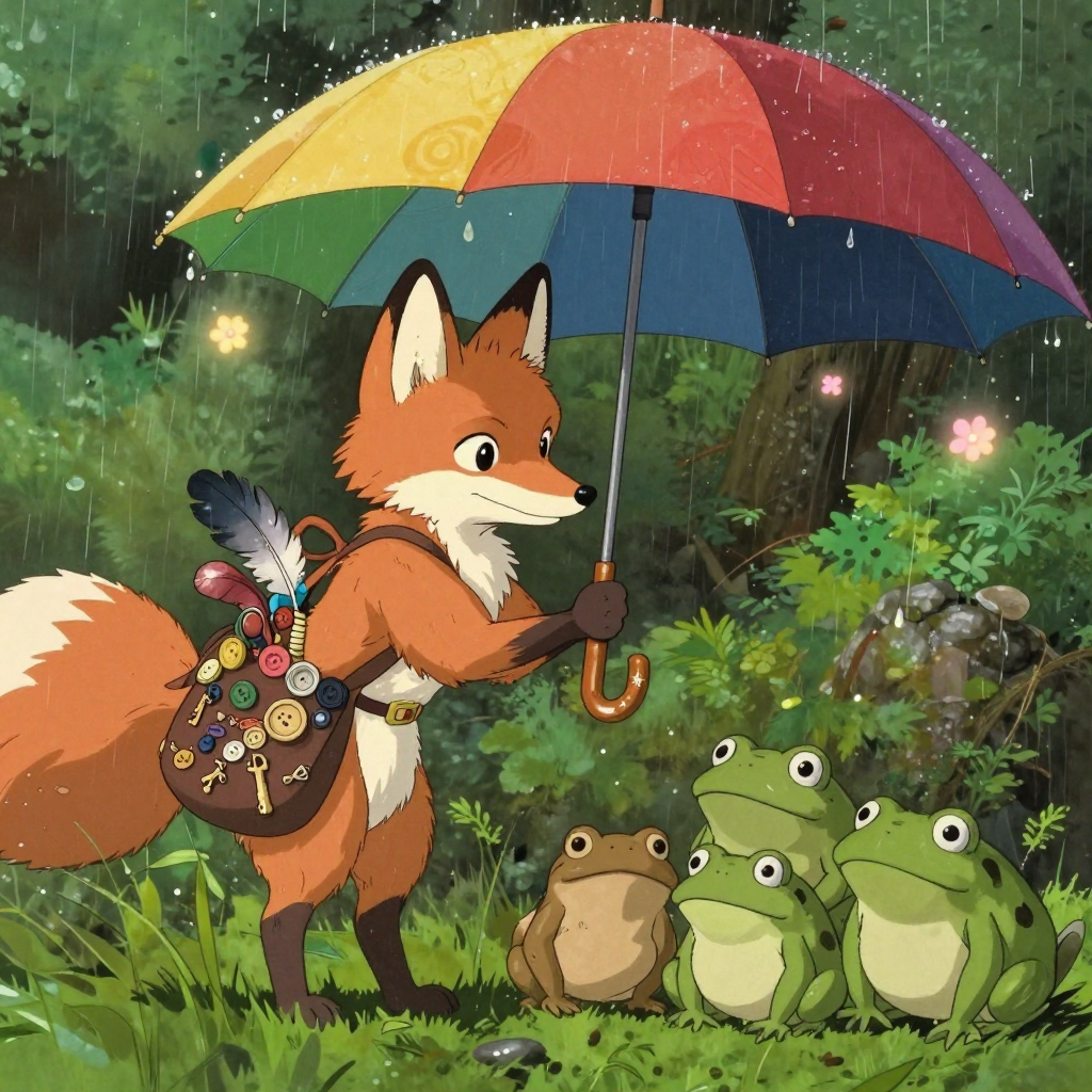 Discover Umbrella in this enchanting page from Nori's A-Z adventure. Nori’s rainbow umbrella blooms glowing flowers as toads smile safely beneath its star-carved shade. Perfect for young readers ages 3-8.