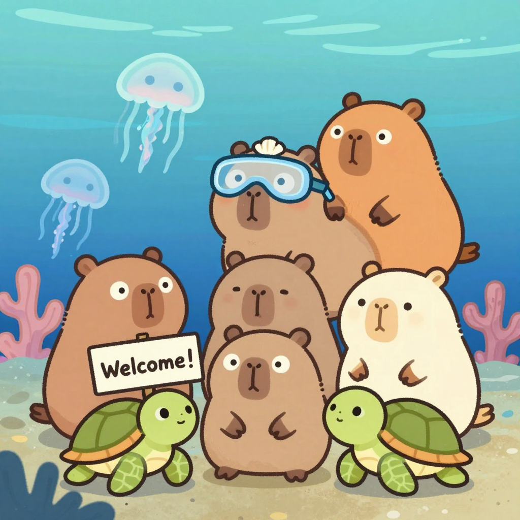 Discover Underwater in this enchanting page from Kappy's A-Z adventure. Kappy swims with glowing jellyfish, wearing shell goggles, as turtles wave “Welcome!” in cozy underwater wonderland. Perfect for young readers ages 3-8.