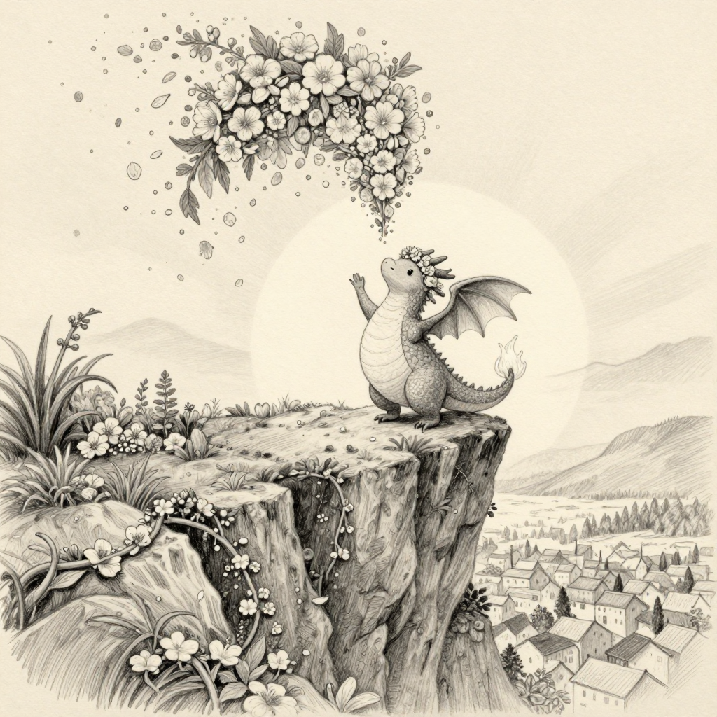 Discover Unfurl in this enchanting page from Ember's A-Z adventure. Ember’s flower crown burst into glowing vines, turning bare cliffs into a dream of blossoms at sunrise. Perfect for young readers ages 3-8.