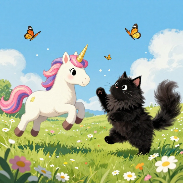 Discover Unicorn in this enchanting page from Fluffy's A-Z adventure. Fluffy the fluffiest cat danced with a unicorn, chasing butterflies and leaping over daisies in a magical meadow. Perfect for young readers ages 3-8.