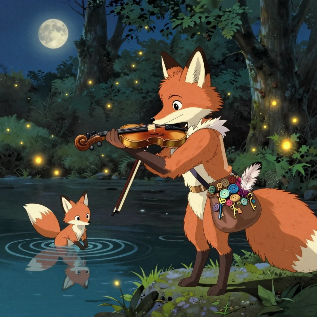 Discover Violin in this enchanting page from Nori's A-Z adventure. Nori’s violin whispers old songs, and fireflies dance with a fox from long ago beneath the moonlit trees. Perfect for young readers ages 3-8.