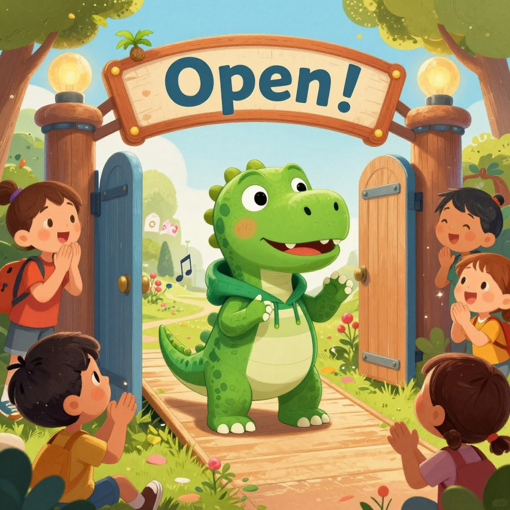 Discover Voice-activated in this enchanting page from Pipkin's A-Z adventure. Pipkin shouts “Open!”—the gate hums a tune, unfolds with a glow, and kids join in with whispers, claps, and hums. Perfect for young readers ages 3-8.