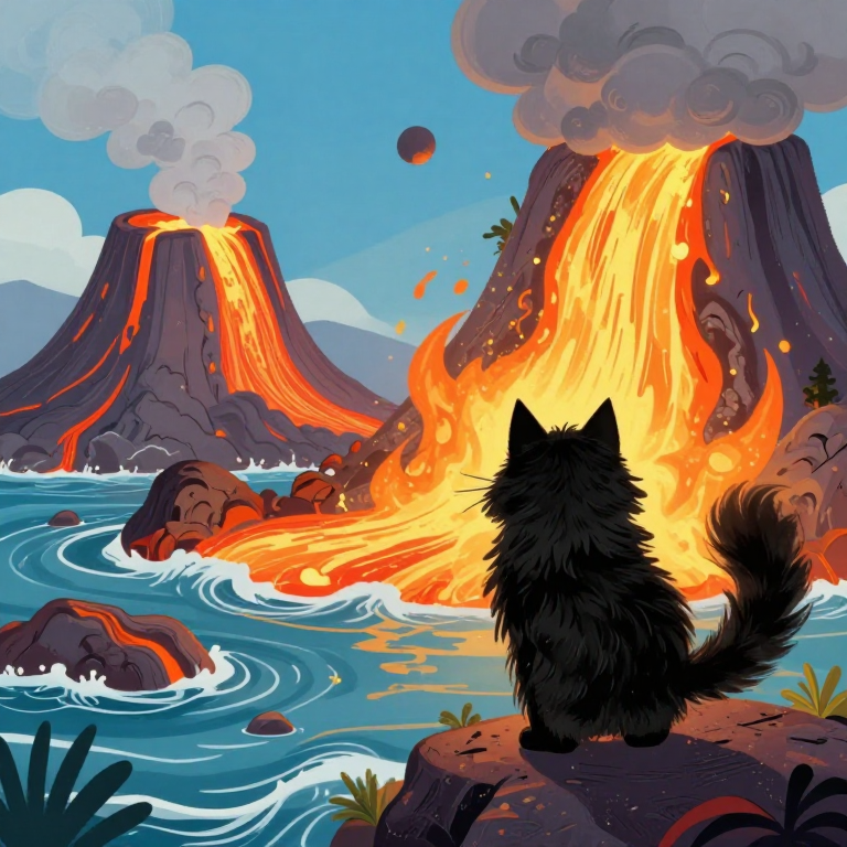 Discover Volcano in this enchanting page from Fluffy's A-Z adventure. Fluffy the fluffy cat watches in awe as lava dances into the sea, creating a steaming new world! Perfect for young readers ages 3-8.