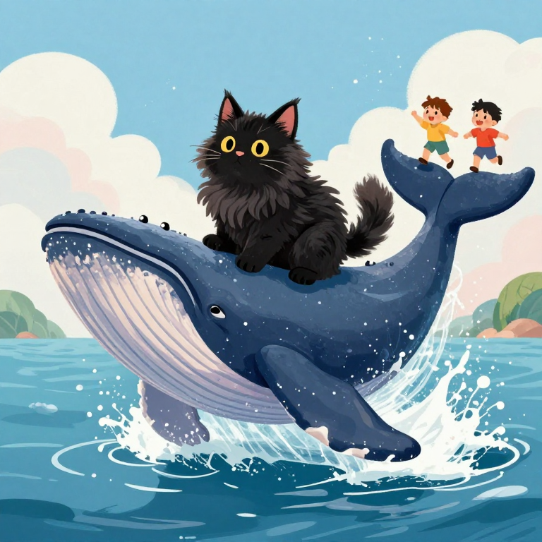 Discover Whale in this enchanting page from Fluffy's A-Z adventure. Fluffy the cat rides on a whale's back, leaping through sparkling waves with joy! Perfect for young readers ages 3-8.