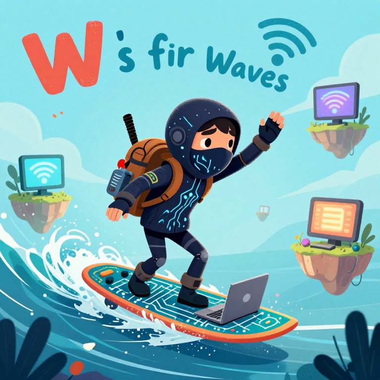 Discover Wi‑Fi Waves in this enchanting page from Mark the Ninja Acrobat Engineer's A-Z adventure. Mark the ninja surfs glowing Wi-Fi waves, connecting screens with a flick of his circuit-board board. Perfect for young readers ages 3-8.