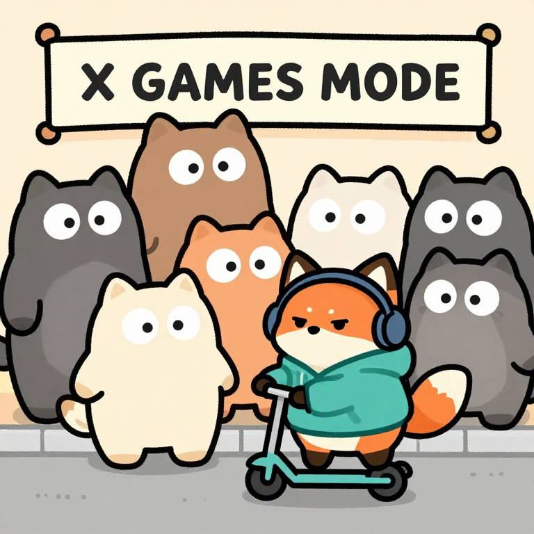 Discover X Games Mode in this enchanting page from Jax's A-Z adventure. Jax the fox hops tiny on his scooter—hoodie flapping, headphones blaring—as gravity takes a nap. Perfect for young readers ages 3-8.