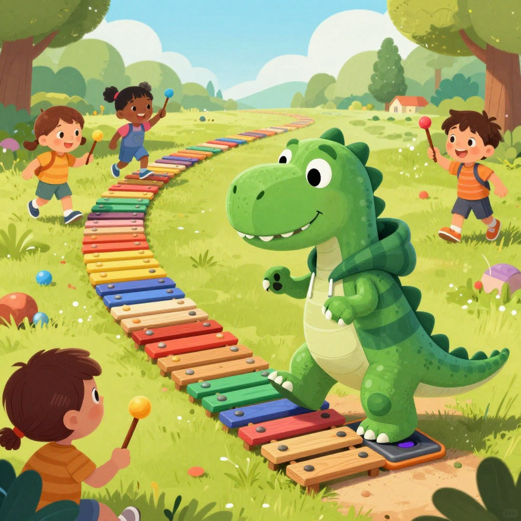Discover Xylophone path in this enchanting page from Pipkin's A-Z adventure. Pipkin taps a xylophone path—colorful notes bounce as friends dance behind, sticks clacking, feet tapping joy. Perfect for young readers ages 3-8.