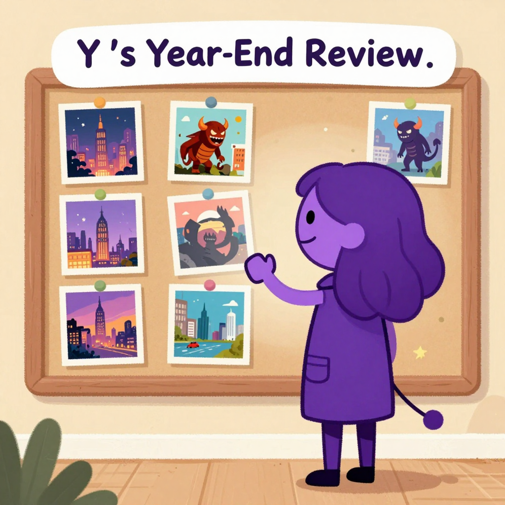 Discover Year‑End Review in this enchanting page from Olive the Demon Hunter's A-Z adventure. Olive’s wavy hair flutters as she smiles at her wall of saved cities and friendly demons. Perfect for young readers ages 3-8.