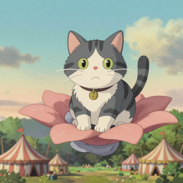 Discover Zeal in this enchanting page from 🎪 Miji's A-Z adventure. Miji the Munchkin cat soars on a petal glider, watching tiny circus tents below in a dreamy sky. Perfect for young readers ages 3-8.