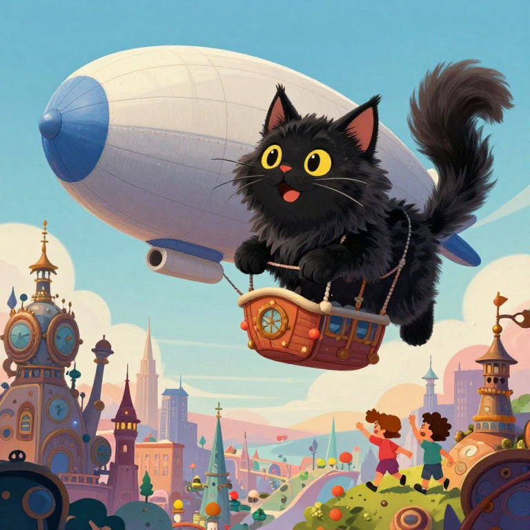 Discover Zeppelin in this enchanting page from Fluffy's A-Z adventure. Fluffy the fluffy black Maine Coon cat grins as her zeppelin floats over a city of towers and wondrous machines. Perfect for young readers ages 3-8.