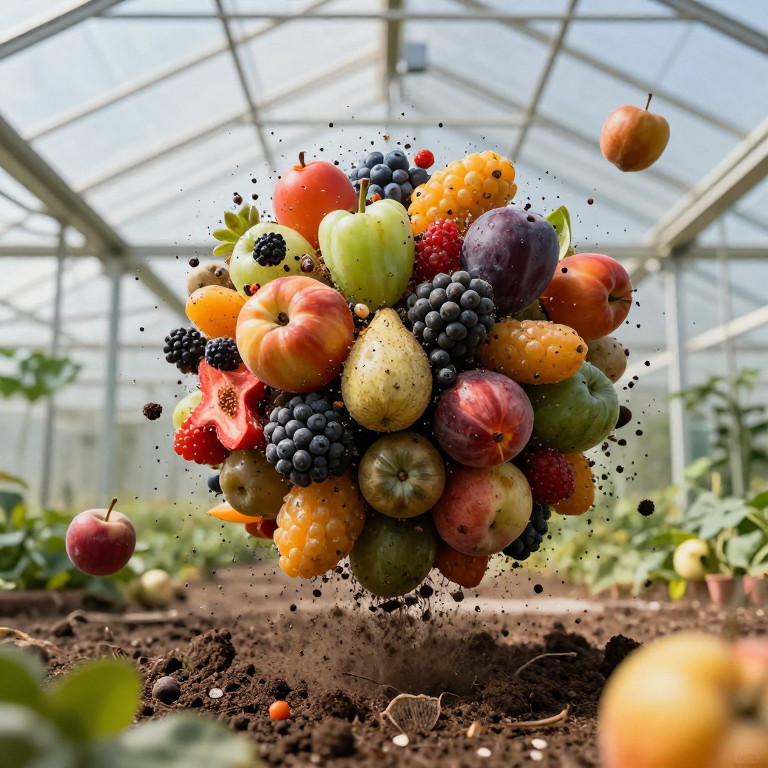 Discover zero-gravity greenhouse exploding in this enchanting page from Pulse's A-Z adventure. Zesty fruits float free as the greenhouse bursts into a rainbow of floating soil and wonder. Perfect for young readers ages 3-8.